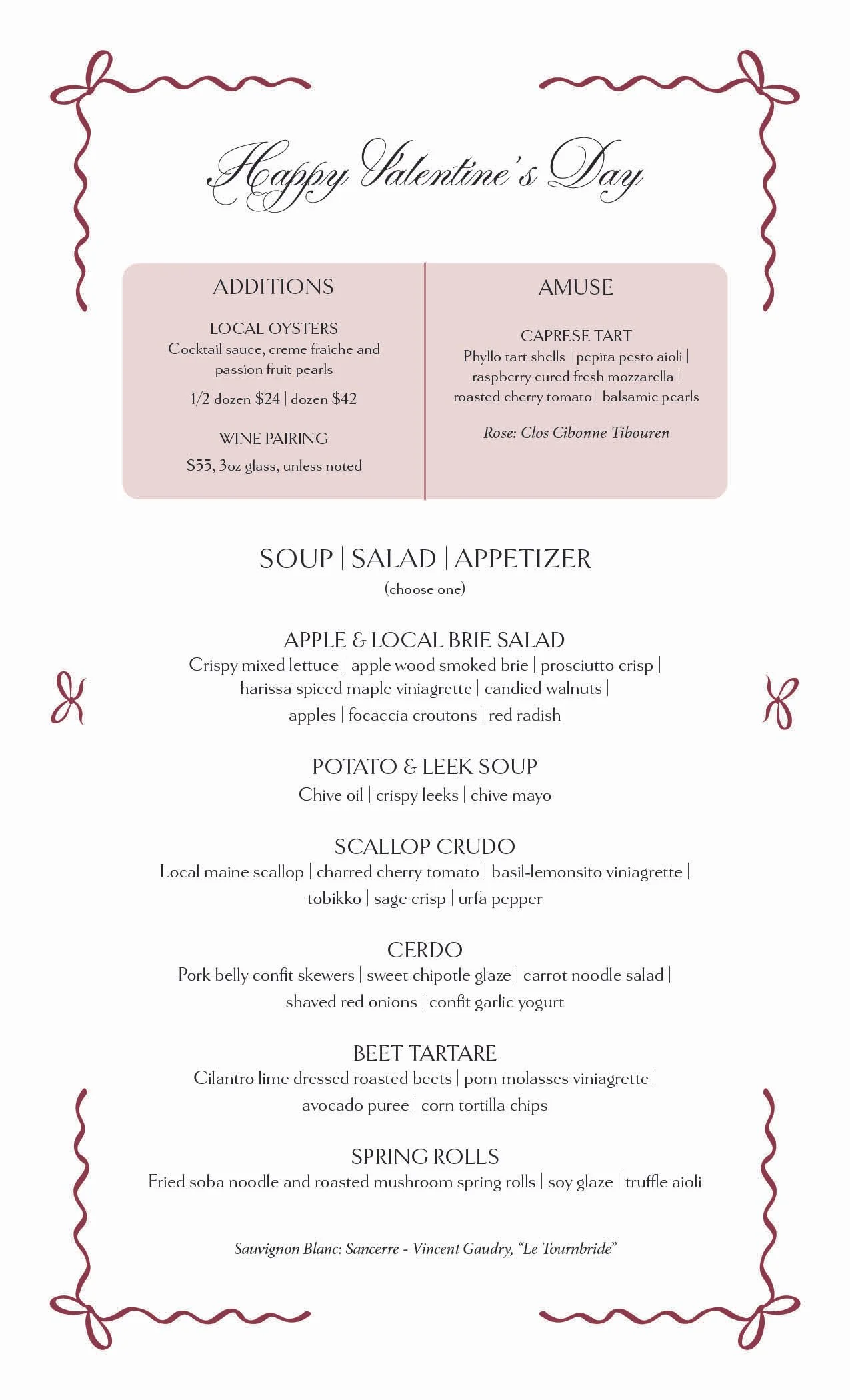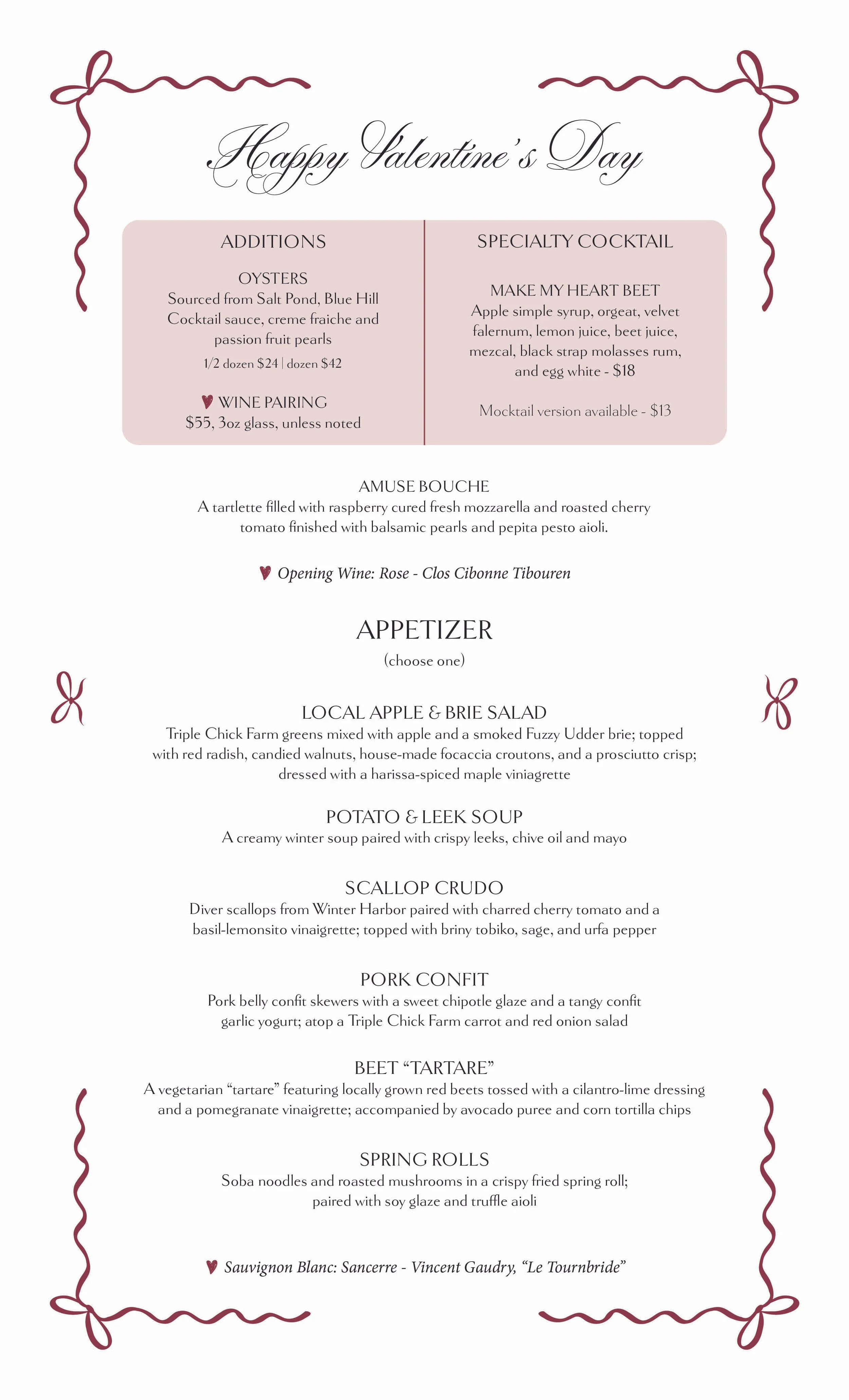 This Valentine’s Day we are offering you a three course prix fixe menu for $95 per person. Each course will have multiple options to accommodate allergies and dietary restrictions. This special menu featuring fresh, local ingredients is crafted for one week only with the prix fixe version offered only on the evening of Valentine’s Day.